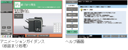 操作手順に困ったときに[ガイド]キーを押すと、詳しい操作手順を画面でご案内します。また、消耗品の補給や交換の手順、紙詰まり時の対処など、詳しい操作をアニメーションで分かりやすくガイドします。