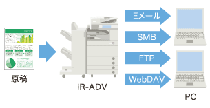 SMBプロトコルによりサーバーレスでオフィス内の情報共有を実現する「SMB送信」のほか、FTP・WebDAVプロトコルを利用した送信にも対応します。また、パソコン同様にさまざまな設定をしてEメール送信も行えます。